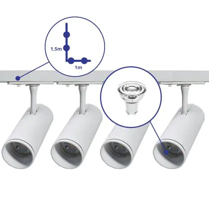 Complete Set 1-Fase Rail L 1 x 1,5 Meter Wit | incl. 4x Spot + GU10 2700K 3W Dimbaar + Eindkap, Voedingsconnector en L -Verbindingsstuk